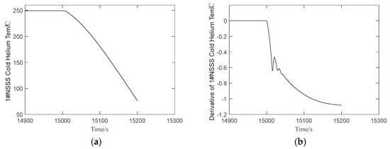 The cold helium temperature response curve to a +1 °C step change in the hot helium temperature setpoint. (a) Cold helium temperature curve; (b) Cold helium temperature rate-of-change curve.