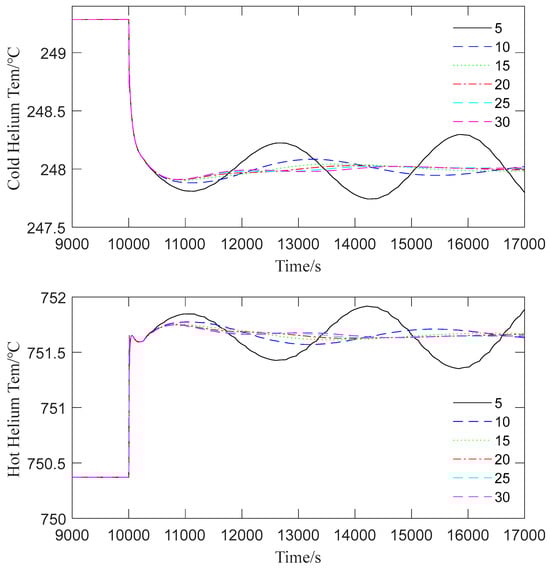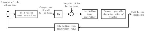 Responses of cold helium temperature, hot helium temperature, and helium flow rate under a −1 °C step change in the cold helium temperature setpoint of 1# NSSS.