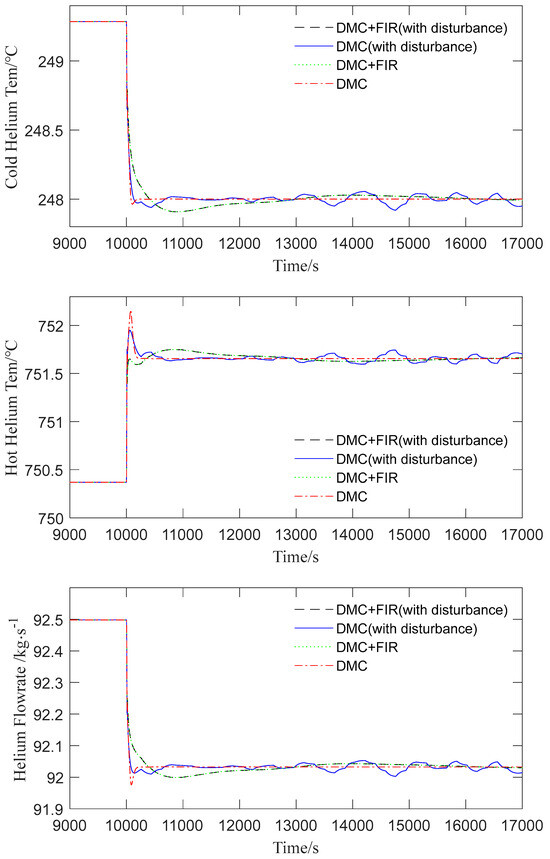 The existing mHTGR coordinated control system adjusts the nuclear power setpoint based on the deviation between the measured and set values of the hot helium temperature, thereby controlling the hot helium temperature through nuclear power regulation. The setpoint for the helium flow rate is corrected based on the deviation of the OTSG outlet steam temperature, and the steam temperature is controlled by adjusting the helium flow rate. In the actual control process, when the cold helium temperature setpoint decreases, the hot helium temperature setpoint increases in order to maintain the cold helium temperature at the desired value. To raise the hot helium temperature, nuclear power must be increased, thereby increasing the thermal power output and the steam temperature at the OTSG outlet. However, the reactor system requires the steam temperature at the OTSG outlet to remain stable. In order to reduce the outlet steam temperature, the helium flow rate must be decreased. As the hot helium temperature increases and the helium flow rate decreases, the cold helium temperature decreases to maintain stable thermal power output. Therefore, the DMC method can control the cold helium temperature by adjusting the hot helium temperature setpoint. Since this method essentially optimizes the upper-level steady-state setpoints, it does not affect the stability of the underlying coordinated PID control.