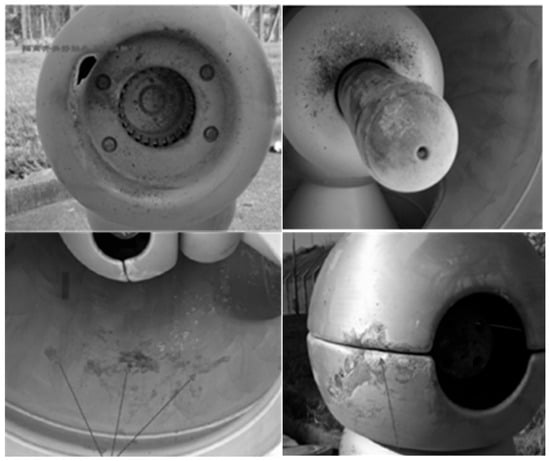 A gas insulated substation (GIS) greatly reduces the floor space because all the equipment is enclosed in the grounded metal shell, eliminating the wire connection between the equipment and the corresponding insulation distance in the traditional open substation. This feature makes GIS especially suitable for use in urban centers, industrial zones, and other areas with tight land resources, which can effectively save land resources and reduce the cost of substation construction, and is therefore widely used [1,2]. In recent years, with the increasing demand for electric power and the increasing voltage level of electric power equipment, the application of high-voltage level GIS has become more and more widespread [3,4]. For a GIS, its insulation fitness level is determined by very fast transient overvoltage (VFTO). It has been shown in the literature that the amplitude of VFTO in a GIS can be up to 2.5~3 times of the rated operating voltage, and the frequency is high and the bandwidth is wide, giving rise to a great threat to the safety of the GIS body and the surrounding equipment. VFTO arises from the operation of disconnecting switches in a GIS. The disconnecting switch is not equipped with an arc extinguishing device, and its operation action process generates multiple ignition arcs. The generated VFTO will propagate on the busbar, forming a fold-reflection waveform as shown in Figure 1. Figure 2 shows a 1000 kV substation during circuit breaker operation, where VFTO propagation through the cable caused a discharge in its enclosure, resulting in insulation damage to the disconnect switch, leading to a breakdown of the electromagnetic lock and tripping of the grounded knife gate.