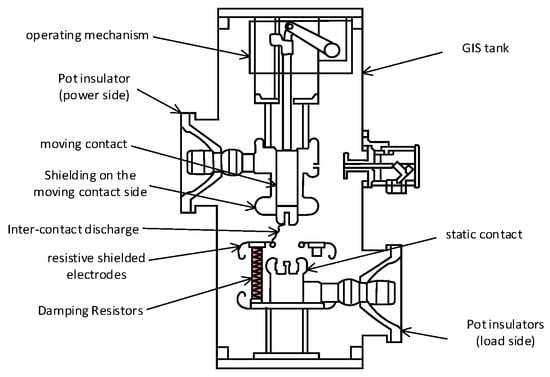The resistance used to dissipate energy is called damping resistance. The mechanism of VFTO generation shows that VFTO is caused by the repeated breakdown discharge of SF6 inside the gas chamber during the operation of the disconnecting switch in the GIS. Utilizing this principle, Toshiba Corporation of Japan proposes to add on–off GIS disconnecting switches to the ports, damping resistors for VFTO suppression. The specific installation location is shown in Figure 3, which is next to the static contacts of the disconnecting switch and connected in parallel with the static contacts [16].