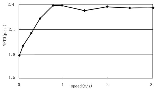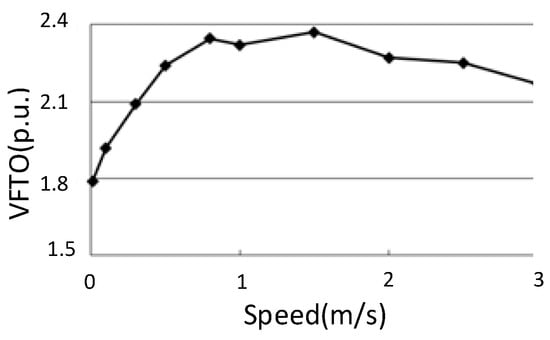 When the switch action speed division was isolated and closing time reduced, SF6 gas re-ignition arc number reduced, the number of breakdowns decreased. Isolated switch action speed slow time division and closing time increases, the leakage increases, the voltage difference between the isolated switch ports decreases, so that the VFTO amplitude decreases. The Swiss ABB measured the residual voltage generated by the slow-action isolation switch through experiments, and found that 99% of the residual voltage is around 0.4 p.u. The above two methods in terms of re-ignition respectively of residual charge analyze opening and closing speed on the suppression effect of VFTO number and amplitude [20,21]. The China Electric Power Research Institute investigated the effect of the opening and closing speed of the disconnecting switch on VFTO by simulation, and the maximum VFTO amplitude versus speed curve when the disconnecting switch is opened is plotted as shown in Figure 4, while the maximum VFTO versus speed curve when the disconnecting switch is closed is plotted as shown in Figure 5.