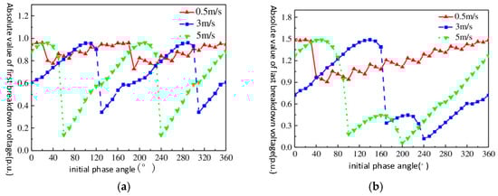 According to the relationship between breakdown voltage and the equations at different opening distances, the effects of different initial phase angles on the first breakdown voltage of closing and the last breakdown voltage of opening are analyzed, as shown in Figure 7.