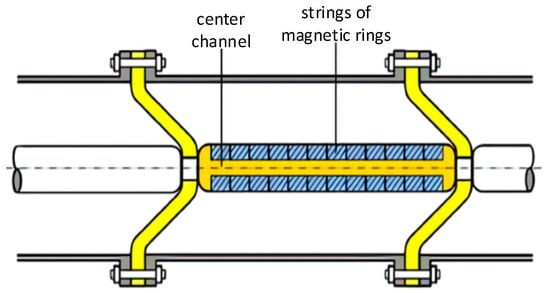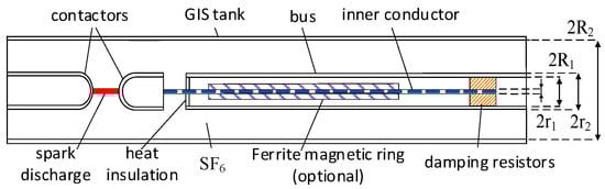 The magnetic ring method of ABB and the ferrite ring method of Tsinghua University both utilize the nonlinear inductance and resistance generated by the magnetic ring’s magnetic conductivity at high frequencies to suppress the VFTO, but there are differences in the way the magnetic rings are installed. The magnetic ring method of Tsinghua University is to install the magnetic ring outside the bus conductor, and the ABB is to install the magnetic ring inside the GIS main conductor, as shown in Figure 12.