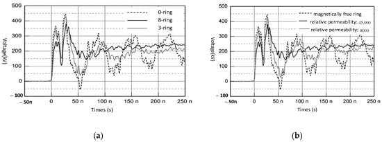 International research on the magnetic ring method to inhibit VFTO research is mainly ABB. The ABB’s research on the magnetic ring method is more systematic, not only to carry out research on the principle of the magnetic ring method, but also to carry out research on the production process and material selection of the magnetic ring. It has used nanotechnology to make nanocrystalline magnetic rings, which are made of iron-based nanocrystals with silicon, boron, and other additives, transformed the amorphous structure into the desired nanocrystalline state by heat treatment, and conducted experiments on the suppression of VFTO for such rings with different number of rings, materials, and sizes. Some of the ABB experimental results are plotted in Figure 11. The ABB experiments show that: