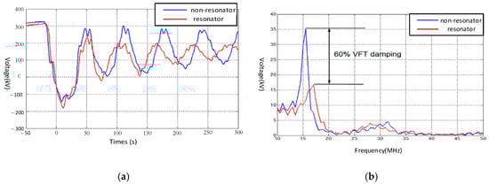 The damping capability of the HF resonator for the VFTO relies on the matching of its resonant frequency FLC with the main frequency component of the VFTO, and the addition of the collector resistor in the gap of the resonator to realize it [36]. The paper [37] verified the damping effect of this method by comparing simulation and measurement, as shown in Figure 14. The addition of the HF resonator is verified by experiments so that the energy of the VFT wave is reduced by 27%, and the VFT main frequency is reduced by 60%, but at the same time, the first peak of the VFTO is slightly increased, instead of increasing its harmonic.