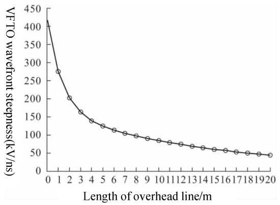 According to the curve in Figure 18, it can be seen that the wavefront steepness of VFTO decreases with the growth of the overhead line, but when the length of the overhead line grows to a certain length, the decreasing trend tends to level off. Changsha University of Science and Technology establishes a 550 kV GIS simulation model under the condition of corona and inductance of the overhead line, and the simulation results show that a 20 m overhead line can suppress the wavefront steepness to within the standard requirements [50]. On this basis, the Power Science Research Institute of State Grid Zhejiang Electric Power Co., Ltd (Hangzhou, China) simulates and analyzes with the real parameters of a pumped storage power plant, and finds that cables and overhead lines have a certain suppression effect on the amplitude and steepness of VFTO [51], but when the cable length is greater than 250 m and the overhead line is more than 4m, the transient attenuation is weakened, and the decline tends to be leveled off.