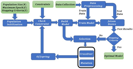 A genetic algorithm initiates a random generation of models, where each gene represents a specific aspect of the model and one chromosome is represented as X in Equation (16). Once these models are generated, they are passed through a constraint check.