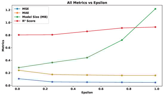 This section explores the relationship between the parameter ϵ and various model performance indicators, specifically MSE, MAE, R2 score, and MS. Figure 8 graphically presents these relationships, allowing for a comprehensive comparison of how changes in ϵ affect each metric. As can be seen, a trend emerged showing that an increase in ϵ led to changes in both MSE and MAE, demonstrating the direct impact of ϵ on minimizing these error metrics. Furthermore, a positive correlation between ϵ and the R2 score was also observed, suggesting improved predictive performance with larger ϵ values, and the MS increased with the value of ϵ .