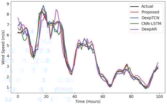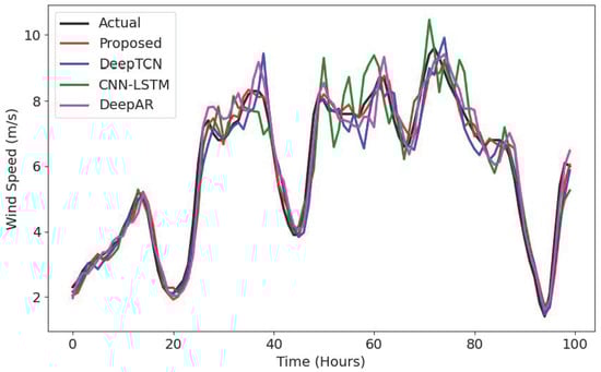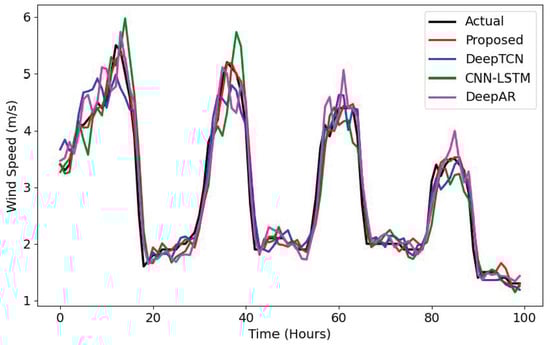 Figure 11. Performance comparison of DeepAR, DeepTCN, CNN-LSTM, and the proposed scheme on the Pasni dataset. The x-axis represents samples recorded at 1 h intervals, and the y-axis represents the wind speed (m/s).