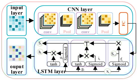 where the outputs of convolutional layer 1 and convolutional layer 2 and pooling layer 1 and pooling layer 2 are and and and , respectively; , , and are the weight matrices of the CNN layers, , , , , and are the deviation values; is the convolution operation; and the activation function is chosen for the fully connected layer. The output feature vector of the CNN layer is denoted as , and the length of the output of the CNN layer is denoted as .