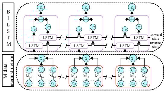 In the formulas, is the forward LSTM output predictive value calculated by inputting the input data, , of Formula (43) into the LSTM neural network (46)–(51); is the forward LSTM input predictive value calculated according to the calculation of the reverse input LSTM neural network (45)–(51); and represent the forward and backward output weights, respectively; and is the offset optimization parameter.