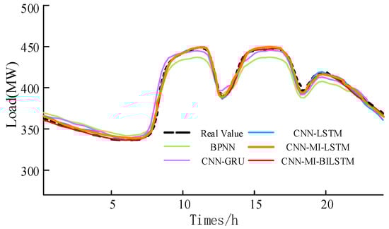 Figure 5 compares the correlation between the prediction results produced by the adopted CNN-MI-BILSTM algorithm and four other mainstream prediction algorithms with the actual situation. It demonstrates the performance of different algorithms in predicting the daytime power-load variation in Gansu, clearly reflecting that the load fluctuates significantly within a day, especially peaking during the traditional peak period of power consumption, while there is a large drop during the trough period. All the prediction algorithms can fit the trend of the actual load profile well. To accurately quantify the performance, Table 2 provides the corresponding MAPE and RMSE metrics for each prediction algorithm.
