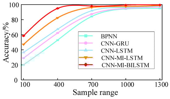 Therefore, Figure 7 shows in detail the accuracy of the CNN-MI-BILSTM algorithm compared with the other four prediction methods under different sample sizes (100, 400, 700, 1000, and 1300). The results clearly show that the CNN-MI-BILSTM algorithm exhibits the highest level of accuracy regardless of the sample size, and the advantage of its prediction accuracy is especially prominent in challenging scenarios with small sample sizes (e.g., 100 samples). As the number of samples grows to 400, 700, and even 1000 and 1300, although the prediction performance of all algorithms generally improves, the CNN-MI-BILSTM algorithm has optimal stability and robustness under different data sizes. Taken together, the proposed CNN-MI-BILSTM algorithm has optimal prediction accuracy under various sample sizes.