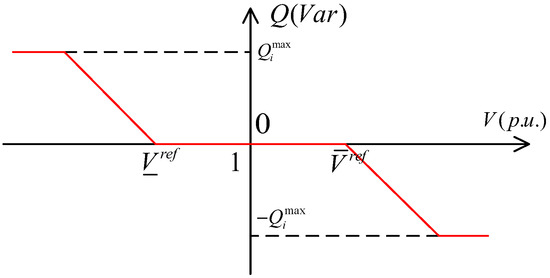 Currently, there are two main reactive power–voltage droop control models: namely deadband-inclusive and deadband-free models. The local control of inverters or SOPs can be implemented based on piecewise droop functions, as shown in Figure 1 [16]. In this control scheme, inverters or SOPs inject/absorb reactive power when locally measured voltage magnitudes exceed the deadband [, ], with real-time reactive power output being proportional to voltage deviation until reaching capacity limits. The traditional droop control mathematical model is expressed as follows: