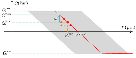 By selecting different voltage intercepts and reference values , distinct droop control curves for inverters can be derived. All candidate droop curves collectively form a feasible region, as illustrated by the shaded area in Figure 2. Consequently, to ensure optimal coordination between decentralized local control and centralized control strategies, and to fully leverage the available reactive power capacity of inverters for the dual objectives of voltage regulation and loss minimization, it is imperative to optimize the selection of the optimal droop curve within this feasible region.