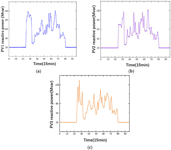 The output reactive power of the PV inverters within the day. (a) PV1 output reactive power, (b) PV2 output reactive power, (c) PV3 output reactive power.