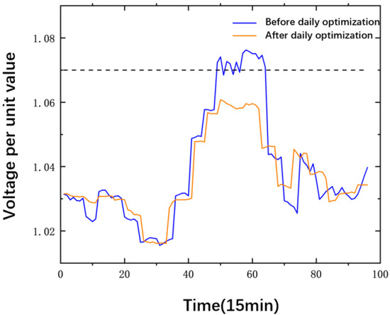 During intra-day scheduling intervals, the predetermined PET output schedules remain fixed during local real-time control. This approach simultaneously coordinates PET’s rapid regulation capabilities and reduces computational complexity. Consequently, only SOPs and PV inverters undergo real-time adjustments during local control. The primary objective of intra-day optimization is to further mitigate PV grid-connected point voltage limit violations and suppress voltage fluctuations. As demonstrated in Figure 9, the voltage profile at PV integration node 22 remains within permissible bounds after intra-day optimization, with voltage fluctuation amplitude decreasing from 0.0607 pu to 0.0447 pu—a 26.4% reduction.