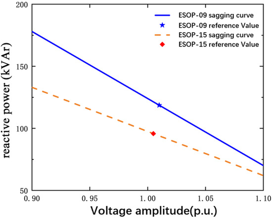 where denotes the voltage intercept of the droop curve, i.e., the voltage magnitude at the intersection of the droop curve with the voltage axis, as shown in Figure 2. represents the calculated reactive power output of inverters based on the linear droop function. represents baseline reactive power reference value. represents reactive power adjustment. When the required reactive power output exceeds capacity limits, the actual output is constrained to the maximum capacity. To ensure control system stability, the control gain is similarly set as .