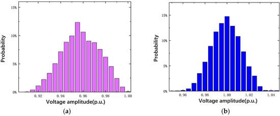 During the three-stage local control, each PV inverter and SOP responds to local node voltage variations based on the droop curves optimized through centralized control. To verify the effectiveness of droop curve-based local control, 2000 random scenarios of PV output power and load data are generated via Monte Carlo sampling, which comprehensively characterizes PV and load uncertainties. For each generated scenario, real-time node voltage magnitudes are obtained using the forward–backward sweep power flow calculation method introduced in Section 2, followed by the determination of inverter and SOP reactive power outputs according to the centrally optimized droop curves. Figure 13 illustrates the voltage magnitude probability distribution at node 16 before and after droop control implementation.