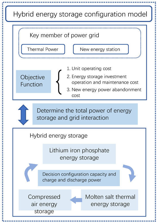 This study developed a hybrid energy storage configuration demand calculation model tailored for high-renewable-penetration systems, based on the supply–demand balance of system flexibility. The model comprehensively considers factors such as thermal unit startup and shutdown operations, renewable energy accommodation, energy storage station configuration, storage system operation, and system capacity reserves. By jointly optimizing the siting and investment scale of energy storage, the model determines the optimal deployment of storage facilities. The configuration framework of the proposed model is illustrated in Figure 1.