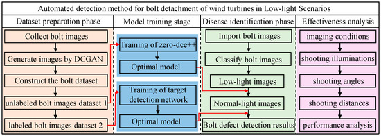 Tower bolts play a crucial role as connecting components in wind turbines and are of great interest for health monitoring systems. Non-contact monitoring techniques offer superior efficiency, convenience, and intelligence compared to contact-based methods. However, the precision and robustness of the non-contact monitoring process are significantly impacted by suboptimal lighting conditions within the wind turbine tower. To address this problem, this article proposes an automated detection method for the bolt detachment of wind turbines in low-light scenarios. The approach leverages the deep convolutional generative adversarial network (DCGAN) to expand and augment the small-sample bolt dataset. Transfer learning is then applied to train the Zero-DCE++ low-light enhancement model and the bolt defect detection model, with the experimental verification of the proposed method’s effectiveness. The results reveal that the deep convolutional generative adversarial network can generate realistic bolt images, thereby improving the quantity and quality of the dataset. Additionally, the Zero-DCE++ light enhancement model significantly increases the mean brightness of low-light images, resulting in a decrease in the error rate of defect detection from 31.08% to 2.36%. In addition, the model’s detection performance is affected by shooting angles and distances. Maintaining a shooting distance within 1.6 m and a shooting angle within 20° improves the reliability of the detection results.
