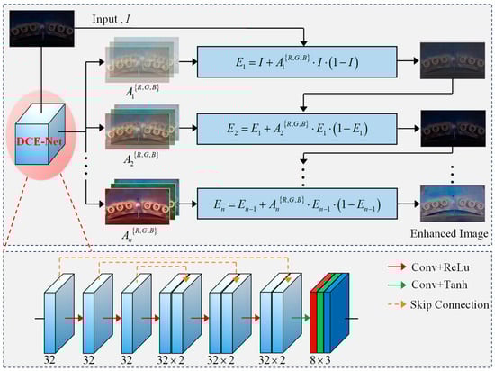 Currently, most bolt defect detection models based on deep learning have achieved remarkable results in normal lighting environments [31,32,33]. However, due to insufficient lighting sources in the vicinity of the bolts, especially flange bolts, wind turbine structures often experience low-light environments. This leads to a significant reduction in the accuracy and robustness of bolt defect detection models, making it difficult to ensure the service safety of bolts in wind turbine structures. Using deep learning methods to enhance low-light images is a feasible solution, mainly including supervised learning and unsupervised learning. Supervised learning methods enhance images by learning the mapping relationship between low-light images and normal-light images, such as LightenNet [34], Kind [35], and Kind++ [36]. These methods require a large amount of paired image data for training and have high dependence on and requirements for datasets, limiting their application in practical engineering. Therefore, unsupervised learning methods have emerged. The EnlightGAN [37] network generates high-brightness images by learning image feature distributions, but it has drawbacks such as unnatural generated images and a large number of network parameters, so it is less used in practical engineering. To improve model inference speed and reduce computational costs, Ma [38] and others proposed an unsupervised learning framework for self-calibrated illumination (SCI), which can achieve network cascading and weight sharing. Inspired by the brightness adjustment curves in image editing software, Guo [39] and others proposed a low-light image enhancement algorithm Zero-DCE based on brightening curves and convolutional neural networks, realizing the remapping of low-light pixels to high-brightness pixels. To balance model performance and computational costs, Li [40] and others optimized Zero-DCE and proposed a lightweight version, Zero-DCE++.