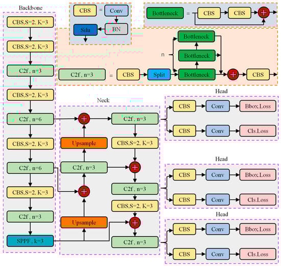 The YOLOv8 model primarily consists of three parts: the backbone network (Backbone), the feature fusion network (Neck), and the detection head (Head) [55]. The Backbone uses a series of convolutions to perform multi-scale feature extraction on the input image. The C2f module integrates residual connections, making the network lighter, with more abundant gradient flow and stronger feature extraction capability. The neck is a feature pyramid network structure (FPN) [56] and acts as a bridge connecting the backbone and head. It further processes the multi-scale feature maps extracted by the backbone and uses upsampling and downsampling to achieve the fusion of low-level detailed features and high-level semantic features. The path aggregation network (PAN) [57] is utilized to achieve a cross-layer feature fusion to obtain multi-scale, comprehensive, and rich feature maps. The head is responsible for outputting the target detection results of three different scale images, all of which are composed of two parts: position and category. The position detection results are generated through a series of convolutional layers and deconvolutional layers, and the category detection results are generated by global average pooling of the feature maps. Different application scenarios can choose networks of different depths, such as Yolov8n, Yolov8s, Yolov8m, Yolov8l, and Yolov8x.