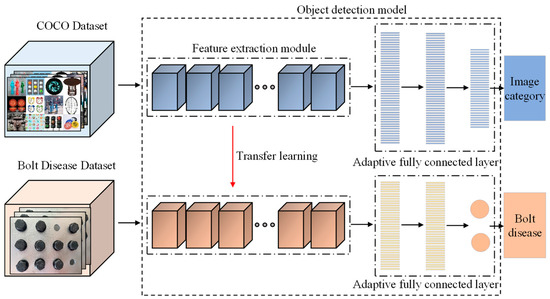The stronger the correlation between the source domain and the target domain, the more excellent the learning effect after transfer. Here, the commonly used large-scale dataset COCO (Common Objects in Context) is selected as the source domain, which contains a total of 200,000 images in 80 categories. The randomly augmented bolt image dataset is taken as the target domain. In a convolutional neural network, the features extracted by each layer of convolution are different. Shallow convolution extracts rough geometric features and has a strong ability to be transferred to the target domain. In contrast, deep convolution extracts complex abstract features and has a weak ability to be transferred to the target domain. Transfer the relevant parameters obtained by training the target detection model on the COCO dataset to the target domain, and then fine-tune the network for the bolt target detection task to train a new bolt target detection classifier. The target detection model based on transfer learning is shown in Figure 5.