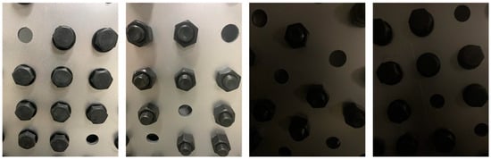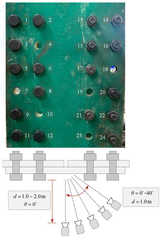 To validate the generalization performance of the bolt detachment detection model, the spliced plate with a complex background in an engineering example is taken as the research object, and the bolt images under different shooting conditions are analyzed. The schematic of image acquisition is presented in Figure 12. The selected segment contains a total of 24 high-strength bolts, which are sequentially numbered from 1 to 24. Among them, bolts numbered 4, 7, 10, 18, 19, and 23 exhibit fractures and detachments.