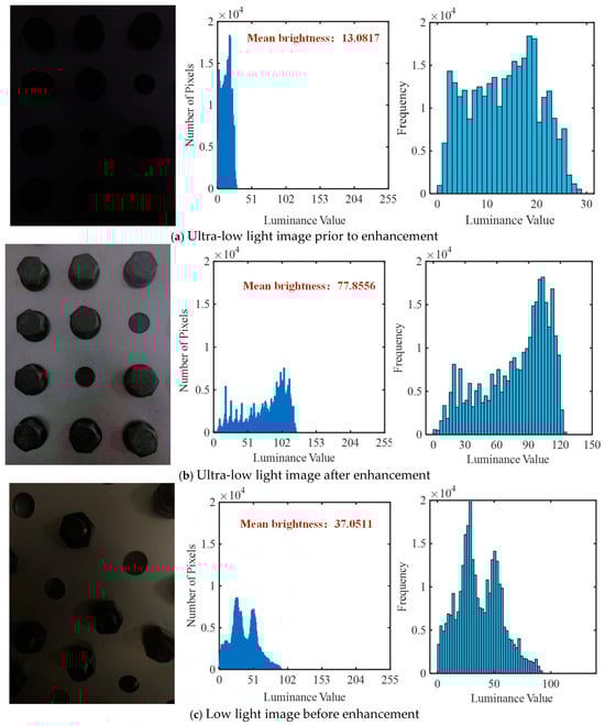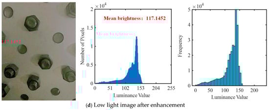 After the training of Zero-DCE++ is completed, the collected low-light images are input into Zero-DCE++, and the enhanced images obtained are shown in Figure 9. The mean brightness of the image is calculated according to Equation (17).