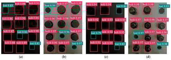 The captured bolt images to be detected are classified according to the mean brightness. For images with a mean brightness lower than 75, light enhancement processing is performed first, followed by bolt detachment defect detection. The limit value of 75 is determined by the mean brightness after the ultra-low-light image is enhanced as described in Section 3.3. The detection results before and after low-light image enhancement are shown in Figure 11. As can be seen from Figure 11a,c, before the low-light image is enhanced, the average detection accuracy of bolt detachment is 82%. As can be seen from Figure 11b,d, after the low-light image is enhanced, the average detection accuracy of bolt detachment is 95.8%. Therefore, after light enhancement processing, both the accuracy and robustness of the bolt detachment detection model are improved.