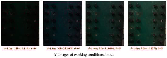 The shooting angle θ is defined as the angle between the camera line of sight and the normal line of the spliced plate. The shooting distance d represents the horizontal distance between the camera and the spliced plate. The lighting environment is measured by the Mb of the image. The Mb (from 10 to 50), distance d (from 1.0 m to 2 m), and angle (from 0° to 40°) are varied, and a total of 12 working conditions are set as shown in Table 4.