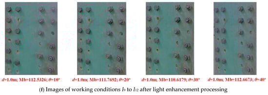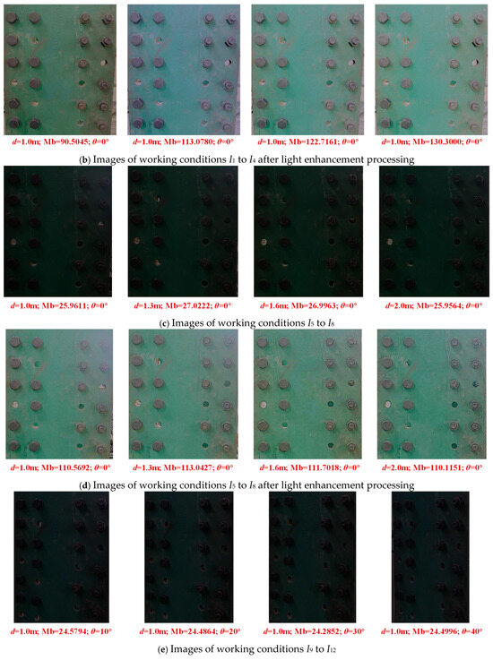 As shown in Figure 14a, compared with the bolt images in low-light environments, after being enhanced by Zero-DCE++, the mean value of bolt detachment detection accuracy is improved to different extents, indicating that the Zero-DCE++ light enhancement network has excellent performance. Furthermore, as can be seen from Figure 14b, in working conditions I1 to I4, the Mb of the image increases in sequence. For images with lower Mb, the mean value of bolt detachment detection accuracy is increased to a greater degree after being enhanced by Zero-DCE++, but the mean value of accuracy after enhancement tends to stabilize.