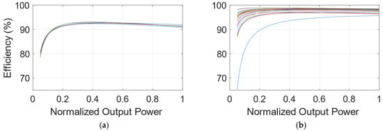Although not a comprehensive comparison, when we compare the normalized efficiency curves of eight commercialized inverters in Brazil in 2007 [4] with the 28 commercial inverters discussed in this paper, it becomes evident that there have been significant technological advancements (Figure 1). Twenty-seven inverters in this study exhibit higher efficiency than those in 2007, with the remaining inverter incorporating older low-efficiency technology. The increase is particularly noticeable for high-power inverters, which maintain high efficiency even under low-power conditions.