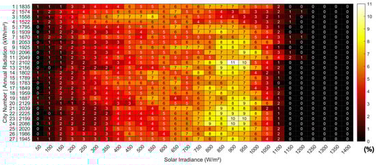 Percentual distribution of radiation at different global incident irradiance levels (data from the Brazilian Solar Energy Atlas [20]) for a typical year in each city.