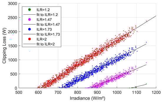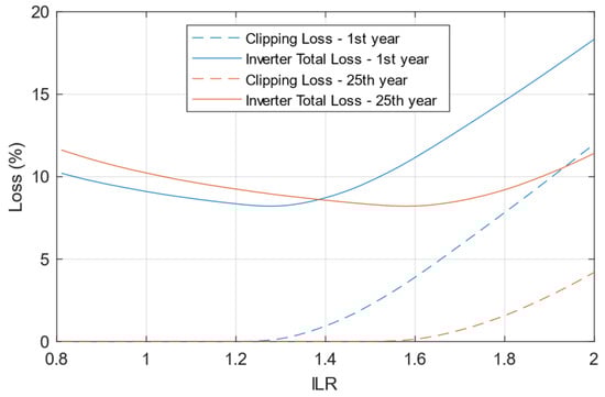 The loss due to clipping is the difference between the maximum theoretical power at the inverter input and its actual conditioning capability. For example, considering the first year of operation (Figure 4), an ILR equal to 1.6 relates to an inverter clipping loss of around 3.9% (Equation (19)), and the total is 11.2% (Equation (20)). On the other hand, when the value is below 1.2, it is insignificant. Over the years, the inverter clipping loss has reduced to 0.15%, and the total to 8.2% due to PV module aging effects negatively impacting its power.