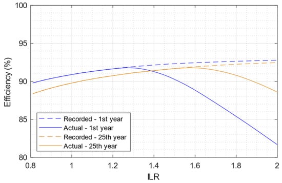 The peaks of the actual efficiency curves (Figure 5) are 91.8%, and in the 1st year of operation, this occurs for ILR = 1.28, and for the 25th year, this occurs for ILR = 1.58; that is, the curve shifts towards the right over time. In practice, the ILR remains fixed, and if it is lower than the ILR at the point of intersection of the continuous curves (1.39), then a reduction in the actual efficiency of the inverter will be observed over the years; otherwise, an increase in the actual efficiency will be observed.