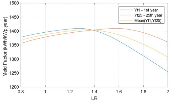 Hence, it is evident from Figure 6 that the oversizing strategy is constrained not only by the maximum input current and voltage of the inverter but also by the yearly optimal ILR, wherein the Final Yield experiences a significant change over time to a fixed ILR.