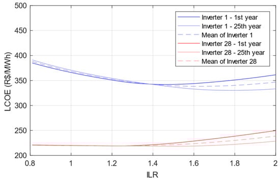 LCOE of inverter 1 (city 1) and inverter 28 (city 1) in the 1st and 25th years of operation in the ILR range [0.81, 2.00]. The means are due to the mean Final Yield, respectively.