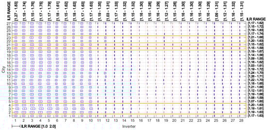 The ILR ranges for each city and inverter are displayed in Figure 8 and Figure 9. In this study, twenty-seven inverters have high efficiency, while only inverter 1 has a low-efficiency curve (Figure 1). When we compared its ILR range behavior with others with equal nominal power inverters (2 to 5), we noticed that it shifted the range to the right (Figure 9); this suggests that more PV power is needed to compensate for the inverter 1 losses.
