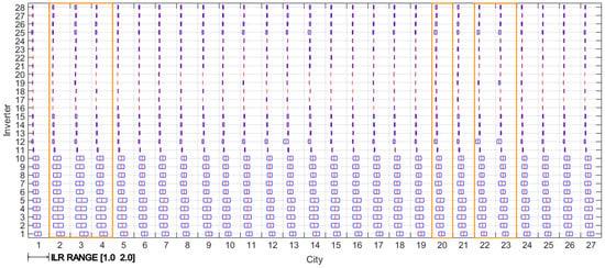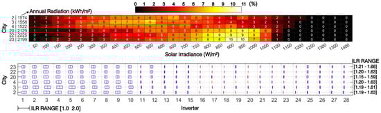 When considering middle- and high-power inverters (ranging from 11 to 28), the differences in ILR ranges were minimal. However, for low-power inverters (ranging from 1 to 10), the ILR range showed significant variability between high- and low-irradiation cities. This difference can be attributed to the combined effects of the expected irradiance levels in each city throughout the year and the efficiency characteristics of the inverters. In high-irradiation cities, where the expected irradiance levels fall between 800 and 950 W/m2 (Figure 10), the inverters operate within a high-efficiency region, leading to similar ILR ranges. In contrast, low-irradiation cities experience a wider range of irradiance below 750 W/m2, and the nonlinearity of the inverter’s efficiency curve has a more pronounced impact on the variability of ILR ranges between cities (Figure 10). Additionally, these cities have higher ILR ranges than high-irradiation cities (Figure 9).