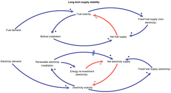 The distinction between up-front and ongoing energy investment is potentially significant in the context of a major energy system transition, as the roll-out of very large amounts of renewable electricity requires potentially large amounts of energy to be invested in the rapid build-out of the production equipment. The CLD represents this behaviour with two loops: one is the same balancing loop as the other energy scarcity–supply loops (i.e., scarcity leads to more installations of renewable electricity, which increases the net supply and reduces scarcity), while another loop includes the up-front energy re-investment, which (temporarily) reduces net supply. The latter loop is a positive feedback loop (even number of negative connections) meaning it reinforces and could potentially destabilise the system. The stabilising loop ensures that over time, the installed renewable electricity increases the net supply, but the double line on the connection from installation to net electricity supply denotes a delay in this stabilising effect.