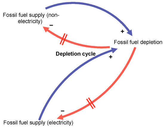 Fossil fuel depletion cycle (for weak climate policy scenarios). (Red: −ve connection, blue: +ve connection).