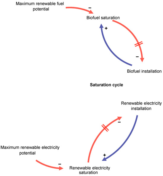 Renewable supplies are implemented differently from fossil fuels, in that they do not ‘deplete’ in terms of stocks that can run out, but instead can be expected to ‘saturate’ as they reach limits of potential. This is implemented conceptually as a negative feedback on installation: the more renewable energy is installed, the closer the system gets to saturation, which curtails the possibility for additional installation (Figure 5). The maximum scale of the renewable energy resource depends on factors such as the availability of suitable land and water for biofuel production, the availability of physical space for solar and wind, and the availability of water resources for hydropower.
