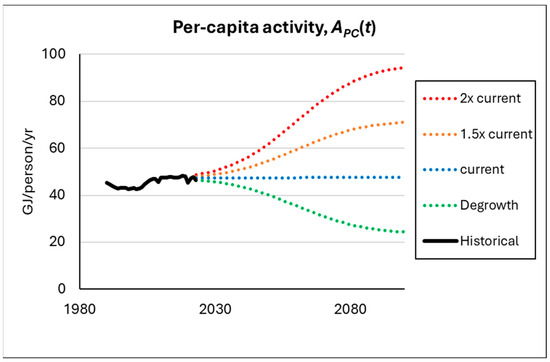 Overall per capita activity at time t is given by APC(t), in Joules/person (final energy demand). APC is a time series allowing scenarios of static, growing, or shrinking demand to be specified. This is then broken down into n different sectoral demands, APC,i, for each sector i such that