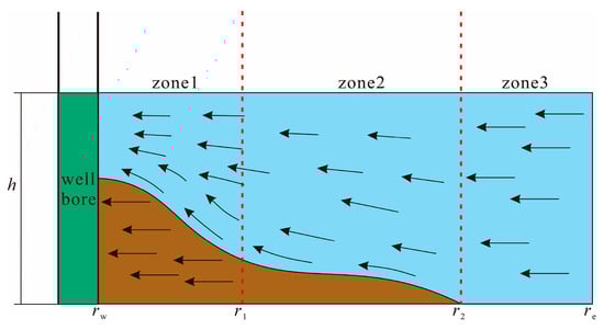 Based on the analysis of the zoning phenomenon of reservoir rock physical properties and fluid properties during the development of carbonate rock condensate gas reservoirs in the introduction, we establish a three-zone composite physical model of double porosity media as shown in Figure 1. Based on radial distance, the model divides the reservoir into three zones: the near-wellbore zone (zone 1), the intermediate zone (zone 2), and the far-well zone (zone 3). Each zone exhibits distinct reservoir properties. In the model, the formation pressures in zone 1 and zone 2 have both dropped below the dew point pressure, resulting in the accumulation of condensate. Among them, in zone 1, due to the large pressure drop, a large amount of condensate oil precipitates, forming a two-phase flow of oil and gas; however, the saturation of condensate oil in zone 2 has not reached the critical value for flow. Therefore, it is mainly manifested as single-phase gas flow containing immobile condensate oil. The formation pressure in zone 3 is always higher than the dew point pressure and it is always single gas flow. As a result, the fluid properties and flow patterns in the three major zones are all different, as shown in Figure 2 for details. The reservoir medium consists of a matrix-fracture dual-porosity system and its flow path satisfies the assumptions of the Warren–Root model (flow path is shown in Figure 3a): that is, the fluid in the matrix only flows to the fractures and not to the wellbore, and the fractures are the main flow channels. This is based on the research in the introduction on the influence of stress sensitivity on permeability and porosity, as well as the comparative analysis of the influence of stress sensitivity on fracture permeability and matrix permeability. In the model, stress sensitivity is considered to only affect fracture permeability. Moreover, since the pressure drop is the greatest in zone 1 during the development of condensate gas reservoirs, stress sensitivity is considered to only exist in the fracture medium of zone 1 (the fracture variation under stress is shown in Figure 3b). Other assumptions include vertical wells producing at a constant rate under planar radial Darcy flow, with rock compressibility and fluid compressibility considered. The isothermal flow process accounts for the skin effect and wellbore storage effect. Boundary conditions encompass three conventional types (infinite, constant-pressure and closed boundaries), with inter-zone interfaces satisfying pressure and flux continuity conditions.