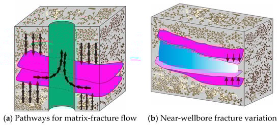 The description of the double porosity media model. (a) The green part represents the wellbore, the purple part represents the fractures and the black arrows indicate the direction of fluid flow; (b) the purple and light purple parts represent the fractures that are not affected and those that are affected by stress, respectively, with the black arrows indicating the direction of stress.