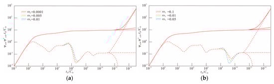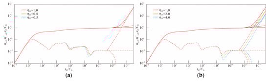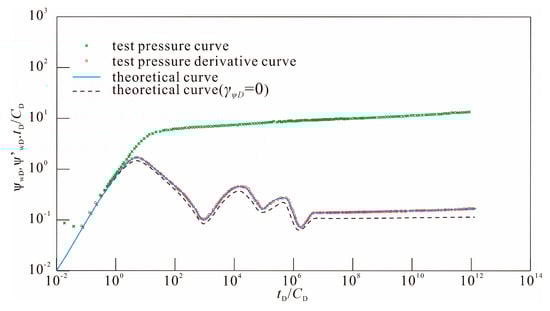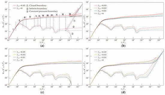 The magnitude of γψD is directly proportional to the strength of stress sensitivity. Through the above comparative analysis of the curve changes of permeability modulus under different boundary conditions, it can be known. Stress sensitivity affects the entire stage of fluid flow in the formation and the influence keeps increasing over time. Permeability stress sensitivity accelerates the rate of pressure loss by continuously reducing the effective permeability and increasing the flow resistance. The difference is that since the infinite boundary and the constant pressure boundary can continuously obtain external energy supply, the pressure wave can continuously diffuse outward without being bound by the boundary. The effect of stress sensitivity is only manifested as the increase in overall flow resistance and the acceleration of pressure drop rate caused by the decrease in permeability and will not significantly expose the boundary effect in advance: the infinite boundary remains in an “infinite energy supply” state throughout the entire testing process and the pressure propagation always maintains infinite diffusion. Although the boundary at constant pressure will eventually be felt, the supply at constant pressure can partially offset the increase in resistance caused by the decrease in permeability and weaken the explicit influence of stress sensitivity. This is completely different from the closed boundary. Because there is no external supply, the decrease in permeability not only increases resistance but also compresses the effective seepage channels, significantly reaching and strengthening the boundary response earlier. Just as obtained from the research of Cheng and Wang et al. [34,35], permeability stress sensitivity will promote fracture closure, significantly reduce the effective permeability and increase the formation pressure loss.
