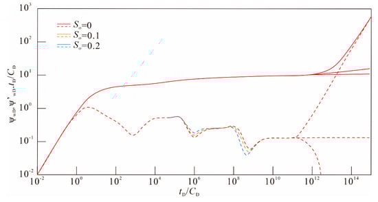 The pressure dynamic curves corresponding to different immobile condensate saturations are shown in Figure 5. The magnitude of So is directly proportional to the content of immobile condensate saturation in zone 2. The curve analysis shows that the saturation of condensate in the zone 2 affects the pressure dynamic curve shape of the whole Stage VII to Stage X. With the increase of condensate oil saturation, the pressure derivative curves of Stage VII shift upward, while the pressure derivative curve of Stage X shifts leftward and downward. The sensitivity analysis further reveals that the pressure loss of gas flow in zone 2 increases with the increase of the immobile condensate saturation in zone 2. This might be due to the precipitation of condensate oil blocking the tiny pores, reducing the relative permeability of the gas and hindering the flow of the gas. As Sabea et al. pointed out in their study [36], the precipitation of condensate oil would lead to the blockage of the pores in the reservoir and the relative permeability of the gas phase would significantly decrease, thereby significantly reducing the flow efficiency of the gas and resulting in an increase in pressure loss. The difference lies in that our research also found that the increase in condensate oil content led to a shortened duration of the flow stage in zone 2, thereby causing the fluid flow in the subsequent stages to occur earlier.